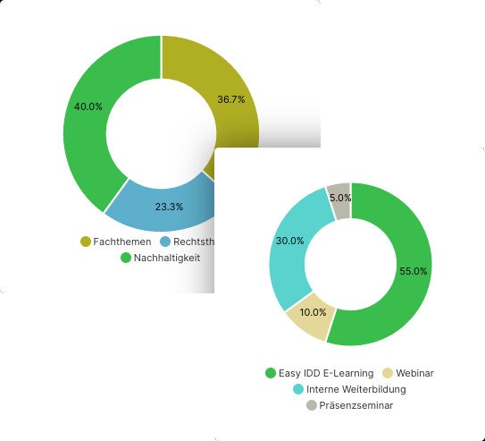 Was sind die bevorzugten Themen Eurer Mitarbeiter? Werden Eure Themenvorgaben eingehalten? Umfassendes IDD Stunden Tool, von EasyIDD E-learnings über interne Weiterbildungen sowie externe Webinaren bis hin zu Präsenzveranstaltungen.